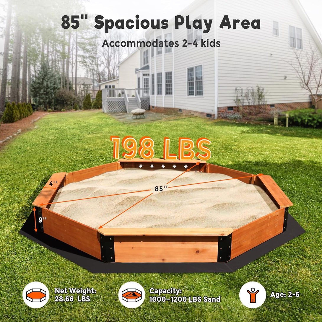 Measuring 85" x 85" x 9", FUNTOK kid sandbox with lid offers a large play area for 2 to 4 children aged 2 to 6. Its octagon design provides ample space for kids to play, build, and explore, transforming your backyard into a vibrant playground that fosters creativity, teamwork, and social skills.