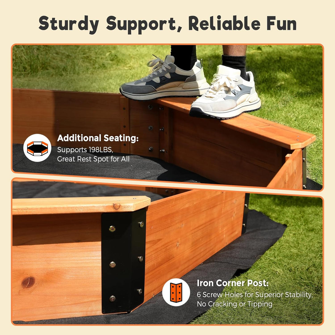 Our wooden sandbox includes four reinforced corner seats, each supporting up to 198 lbs. These wide benches provide comfortable rest spots for kids and prevent them from sitting directly on the sand. Additionally, it is equipped with 8 PCS Iron Corner Posts for superior stability, each featuring six screw holes for enhanced reinforcement.
