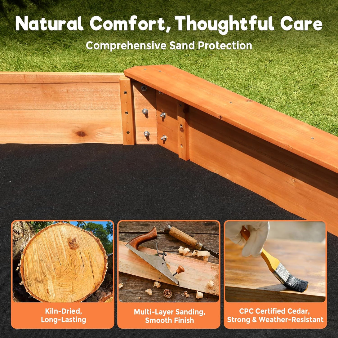 Our toddler sandbox with cover is kiln-dried to ensure dryness and long-lasting resilience. The multi-layer sanding and oil brushing processes ensure a smooth, splinterless finish. Made from certified cedar, it is exceptionally strong, weather-resistant, and has excellent anti-corrosive properties.